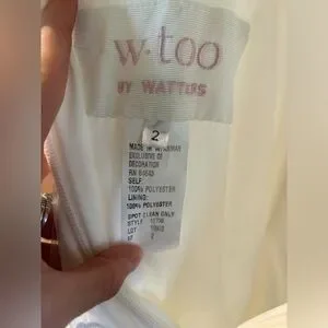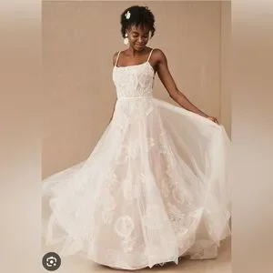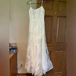 I bought used but did not wear so it’s been worn once. Please see my pics -I removed the outer tulle skirt for a more a-line look, and to showcase the beautiful floral pattern more. Tag size 2, street size 2. 43 inches from waistline (where ribbon is) to floor.