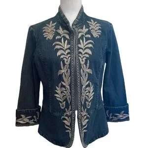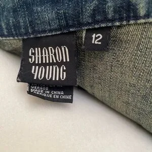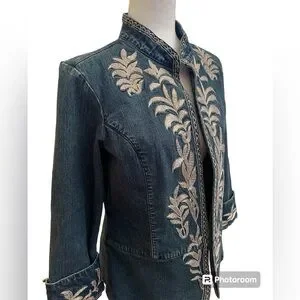 Beautiful Sharon Young Jean jacket with golden thread carvings and borders. Size 12
