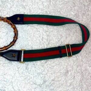 ๐ Signature Gucci red and green detachable & adjustable strap with leather trim and gold-tone star embellishments