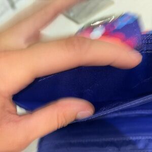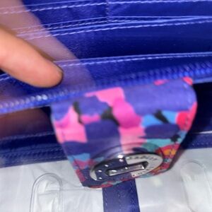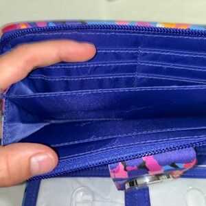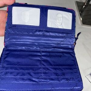 This is a beautiful Vera Bradley Wallet with zipper on back for coins. Opens to blue/purple card slots totaling 6. Has 2 plastic openings for license, id, etc. There are 2 openings for money. Has zippered opening on the back side holding 6 slots for cards and 3 slots for bills, receipts, etc. This wallet has it all.