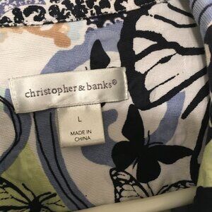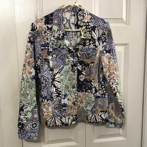 Nice lightweight Christopher & Banks jacket in blues, green and tan, pewter front button closure and 4 front pockets. Size large. good used condition
