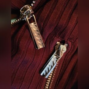 NWOT Stylish Jacket/Blazer/Top, Versatile, can be zipped up two different ways, creating a different look, also changes the width of the waist. Beautiful gold finishes for classy look. That's not scratches on the button, just reflection from camera. Excellent condition, absolutely no flaws. Unique colour, Burgundy, purple, eggplant. Tagged med, but could fit xs/sm.