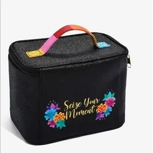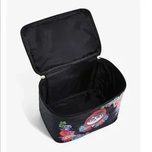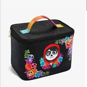 LIMITED EDITION Prepare your land of the dead look with the help of Miguel from Disney’s Coco Make up bag with Miguel and the frog with floral and sugar skull arrangement on the side and back the bag is black with silver Metallica dots bag is9Wx7Hx6D