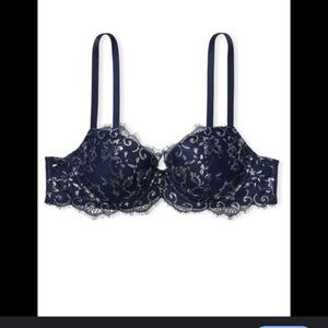 NWOT Victoria’s Secret lace navy blue and shiny silver lightly lined Demi bra. Beautiful, classy, and sexy. Matching panties listed for sale in my closet as well.
