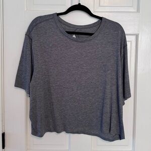 Lululemon Athletica intended short sleeve. Heathered Midnight Navy colorway, looks like a grey color. Loose fit. Bonded construction helps seams lie flat on the skin. Tie the back slits to keep in place or wear open for ventilation. Fabric is anti-stink, sweat-wicking, and quick-drying with a soft, cottony feel. Perfect workout top or layering top to wear to and from your workout!