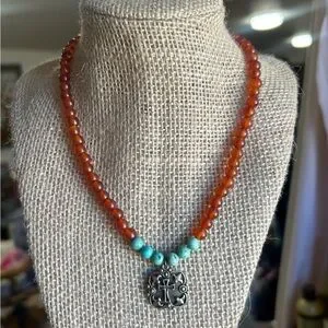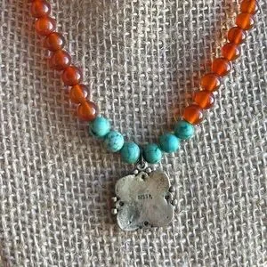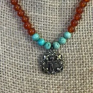 Beautiful 925 sterling silver cross pendant with stamp on back, surrounded by round cornelian and turquoise beads on an 18 in chain