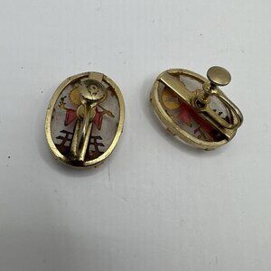 Vintage Geisha Earrings Clip On Twist On Hand Painted Gold Oval Earrings