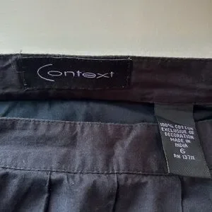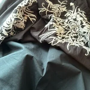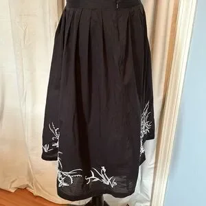 This beautiful black skirt with white embroidered accents is ideal for work, social events. Pair it with a white cardigan and ballet shoes or heels. Very versatile and flattering. Skirt is lined. 100% cotton. Machine washable. Size 6. EUC. Waist to hem measures 24”.