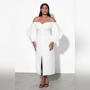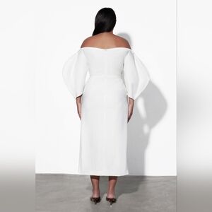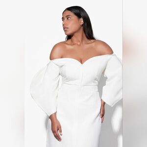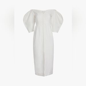 Leonara is a fully-lined column dress with a fitted waist and rounded, off-the-shoulder sleeves. Curved boning along the sleeves and sweetheart neckline extends down the center of the dress. Featuring elastic at the shoulders to keep the sleeves in place, center front slit for mobility and center back zipper. Made from a blend of TENCEL Lyocell and linen.