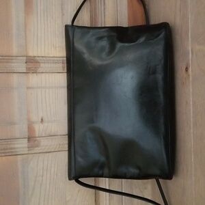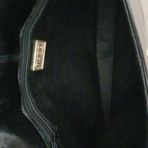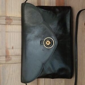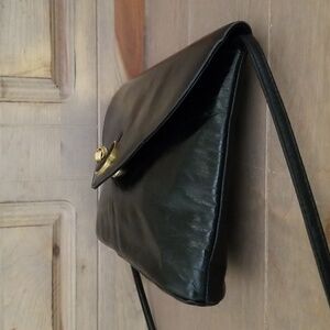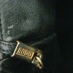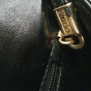 Vintage Rodo Italy Shoulder Bag. Front snap closure with gold tone adornment, spaghetti shoulder strap, smooth soft leather. Interior features one zippered pocket and gold tone logo and strap attachments. Some wear noted to interior too where gold tone strap holder meets the leather. Very good condition.