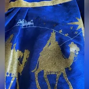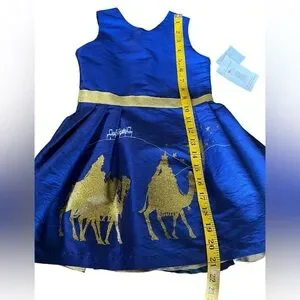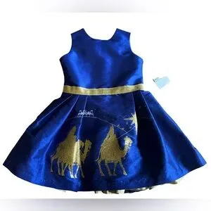 Brand new with tags from Nordstrom. Dress is made in San Diego, California. Please see photos for measurements and reach out with any questions. This beautiful holiday dress is ready for any party or special event. It has a graphic print / Three Wise Men desert scene printed in gold metallic, glitter on the front with a gold metallic bow around the waist. It is fully lined and has gold ribbon trim in the skirt underneath. Gorgeous! MSRP $88