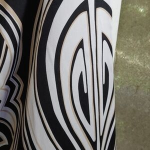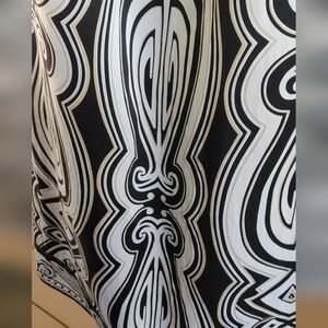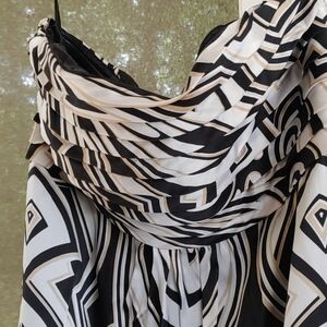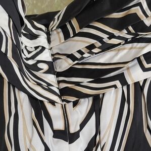 Black, white & tan design strapless dress w upper folded pleating, rear zip w lining. Has a non-slip upper surround. Made of 100% silk. Length is 47 inches