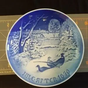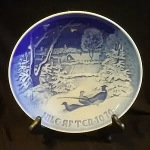 This beautiful collector plate from B&G Of Copenhagen features a charming design of Pheasants in the Snow at Christmas in Denmark. The plate is made of high-quality porcelain and has a diameter of 7 inches, includes holes and wire to hang. Its vintage style and blue and white pottery production technique make it a perfect addition to any collection. The plate is ideal for Christmas occasions and is sure to impress any collector of decorative items. Its production in Denmark adds to its unique culture and history. This piece is a must-have for anyone who appreciates the beauty of Danish art and pottery.