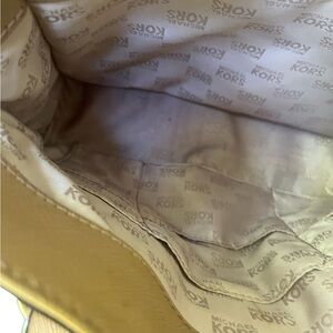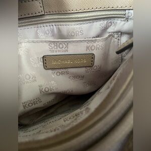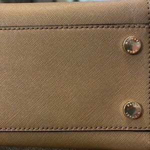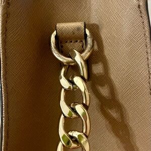 This authentic Michael Kors purse is tan with gold accents. It is used, but in great shape! It’s a medium size with a long shoulder strap, but also smaller hand straps so you can carry it. The longer strap cannot be removed. There is slight wear on the chain and a small spot where chain connects, but is barely visible (see pics). There is a small dot on the inside of the bottom of purse, but again is barely visible (see pics). The bottom gold dots of the underneath side of purse have some wear (see pics). It is very clean on the inside and has many nice pockets in the inside to store your things. It measures 12 inches across and almost 9 inches from top to bottom. This bag is in great shape and comes from a smoke free home!