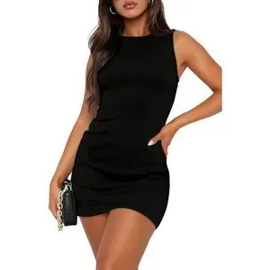 Women's Black Sleeveless Boat Neck Mini Dress Slim Fit Party Club Bodycon Dress