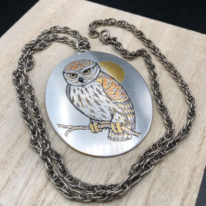 Reed & Barton Necklace 24" Damascene Owl Moon Etched Metal Silver Tone Pendant