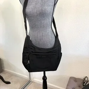 Baggallini Black Nylon Crossbody Bag. Lots of storage and slots. Lightweight and great for travel. Like new condition. Only used once. Approx. 15” x 9.5”.