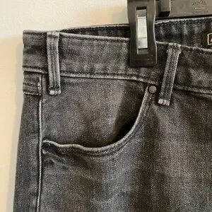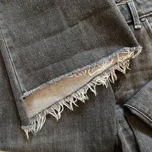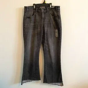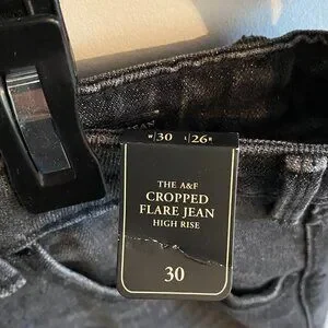 Never worn, with original tag. "A&F" Cropped Flare Jean." Structured charcoal/black denim with some stretch. Cropped fit. Asymmetrical frayed hem. High rise with button and zipper closure. Four pockets.