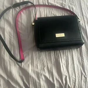 Kate Spade Crossbody bag. Black with fuchsia. The bag is nearly flawless, however, there are a few scratches on the metal logo. Bag only used a few times. In excellent condition. Slight bend in strap at top as shown in photos. All offers will be considered.
