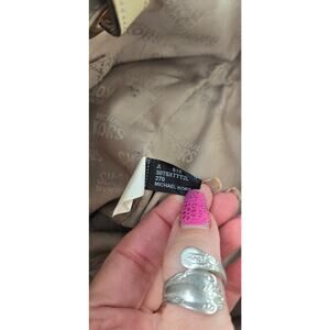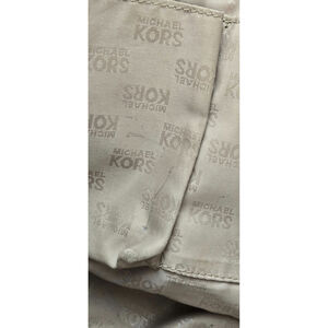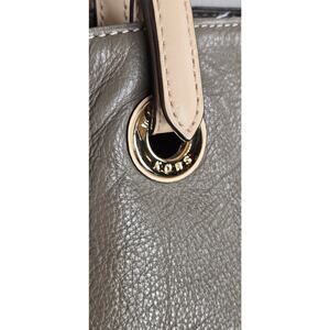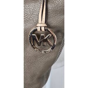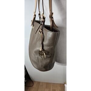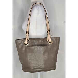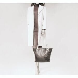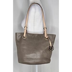 This Michael Kors Jet Set Travel shoulder bag is a stylish and functional accessory for any woman. The bag features a solid pattern and a rectangle shape, & a magnetic snap closure. The double handles are made of tan leather and have an 10-inch drop, while the hardware is gold in color. The exterior is made of high-quality leather in a beautiful pewter gray color, with a logo bag charm for added interest.