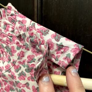 A perfectly lovely 98% cotton sleeveless top by J. Crew. It has pink flowers and a ruffle button neck top. It's NWT (orig. retails $69.50) but has a flaw - one button is missing - see photo. It measures !7" from pit to pit and 23" in length. Darling top!
