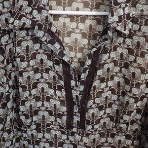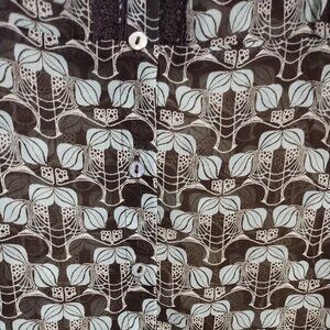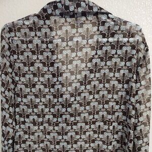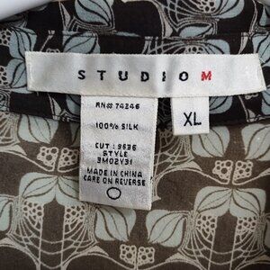 A beautiful button-down lightweight silk blouse with gorgeous lace details on front and sleeves. Pearlized buttons. Easy to pair for both casual and dress up occasions. 100% silk. P-to-P: 21". Length: 24". Label lists "XL"...but it's more of a large.