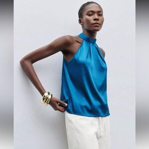 Teal Blue Satin Halter Blouse Top