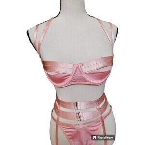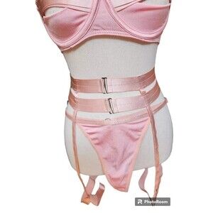 3 piece intimate set-bra, garter, thong. Bra has peekaboo slits, garter features elastic band leg cuffs.