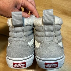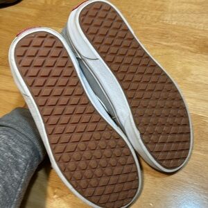 These shoes were bought for my daughter. However she only wore them once, around the house to see if she liked them. She ended up not liking the style and were too big for her. These shoes are Like- New condition. The only “wear” on them is from white socks, as there are white fuzzies on the back of the shoe (inside). Since the shoes were too big for her, her heal then slid up and down creating white fuzzies. Fuzzies can be pulled off. Color: Grey and white. Women size 6.5