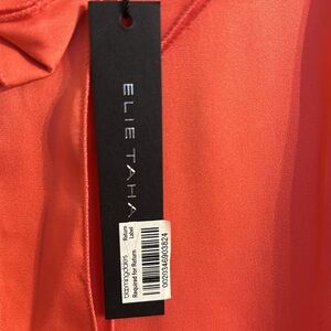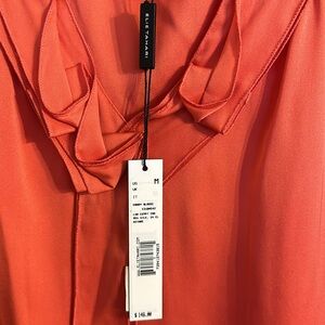 NWT-Elie Tahari silk top, orange, sz Med. Beautiful silky flow, subtle ruffles encircle entire neckline. 95% silk, 5% elastane for comfort. Would be adorable with a denim jacket, with a suit, or topping a cute skirt or shorts.
