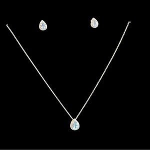 This is a matching set of pear shaped earrings and pendant. They are lab created blue topaz’s with tiny diamonds. The earrings have post backs for pierced ears. The necklace measures approximately 18” long. The price tag was only for the necklace, please consider that when looking at the selling price. This was also purchased about 15 years ago so probably considerably more expensive today.