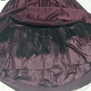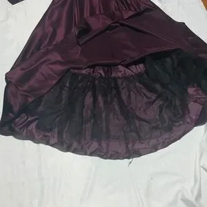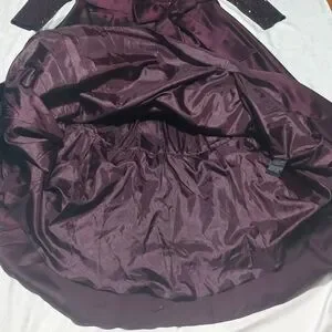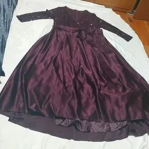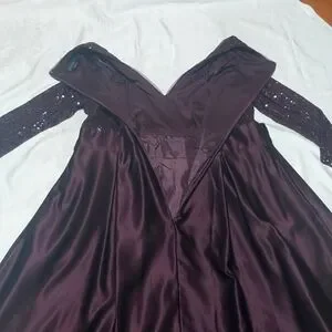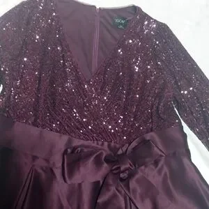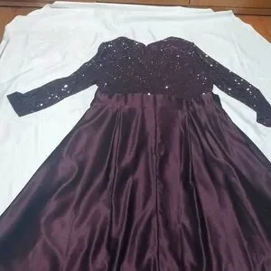 This is the perfect gown for that special occasion. has long sleeves with an 11" V Neck cut and a sequence top,a tide bow around the waist, the skirt has a high low cutting at the bottom.