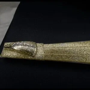 Carry a cute clutch to your next formal event. It's black satin, foldover style with gold pleated lame and rhinestone jewel trim. Inside has one pocket and the long cord can be stashed in there when you use it as a clutch. This is vintage deadstock (unused) from late 60s to 70s. My Galaxy cell phone fit!