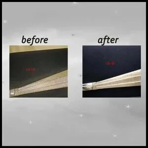Evening clutch converts to a shoulder bag. One tiny flaw is a storage hole which can be seen in the 2 "before and after" photos. The "before" shows the tiny hole, the "after" is what the hole now looks like after dabbing it with black marker so it's not as noticeable.