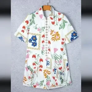 White Floral Print Split Neck Pocketed Shirt Collar Romper.