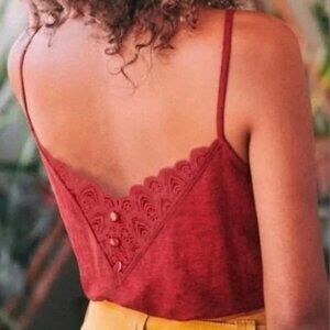 Sézane Elise Tank in Terracotta and Women's Size XS. 100% linen. Lace is cotton. Button back detail with lace. Made in Portugal. Very good pre-owned condition. No visible flaws.