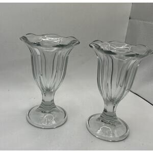 Indulge in your favorite cold treats with this set of two vintage glass ice cream sundae glasses. These clear glass dishes feature an abstract shape and a diameter of 3 3/4". The glasses are 6" tall and have one compartment, perfect for serving up your favorite ice cream or other cold desserts.