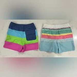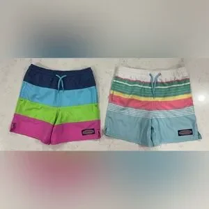 2 Pairs of Vineyard Vines chappy swim trunks, boys size 7. Neon 4 panel pair (on left) has small stain on back as shown in pic. Pastel pair (on right) has stains on back. Lots of life left!