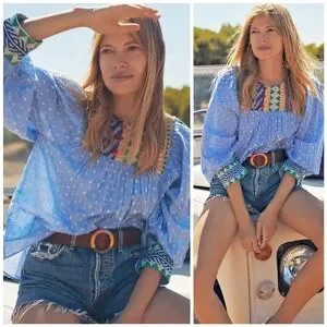 Anthropologie Verb Embroidered Swiss Dot Boho Blue Top