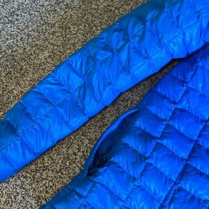 Bright blue color women’s north face zip up jacket. Has plenty of pockets. In excellent condition. I only wore this for half a season. It’s too small for me to wear anything underneath. I wish it fit me. There’s really nothing wrong it. It does not have a hood.