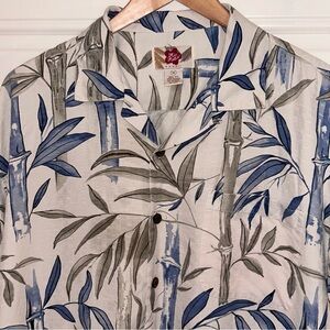 Vintage Hilo Hattie Silk Tropical Beach Bamboo Print Ivory Hawaiian Button front Short Sleeve Camp Shirt . Men’s size M / Medium. Cream Ivory with tropical leaves & bamboo print in olive taupe green green & blue . Coconut shell buttons . Excellent condition. No holes or stains . Perfect for your summer vacation, a luau , or hanging at the tiki bar .