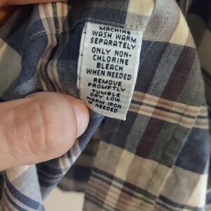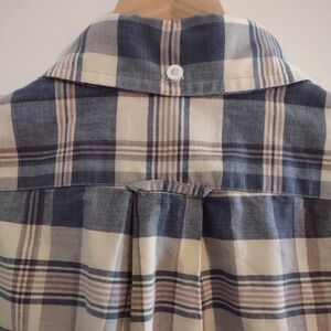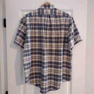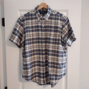 Men's size large L Ralph Lauren short sleeve button down shirt. Soft, lightweight cotton fabric. Features an all-over plaid pattern with tan, blue, and grey. Details include button down style collar, front chest pocket, button down fastener on back collar, and hanging loop on back. See photos for condition. No stains or holes. Reasonable offers always welcome!