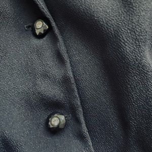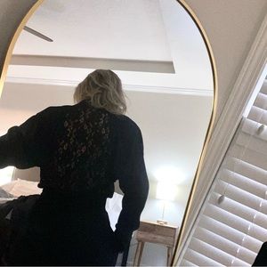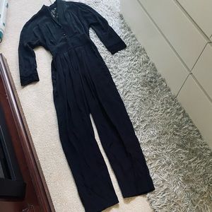 Questions? Leave a comment below! Awesome vintage jumpsuit. Sheer lace back. Gem stud buttons in front. Pockets. Black. Excellent condition. Flattering waistband. Lace on sleeve also. Size and material tags missing. I’m guessing a polyester like material and I am around 130lb and this fits me. I’d say comparable to a size small/medium although does have some stretch at waistband. This is a vintage piece but would totally fit in with today’s modern style, but still be unique! Ships same or next day.