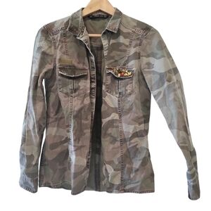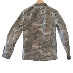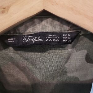 This stylish and functional army print utility jacket by Zara is a perfect addition to any wardrobe. The relaxed fit is comfortable and flattering, and the multiple pockets add a touch of utilitarian style. The jacket is made from a soft and durable fabric that's perfect for spring and fall weather.