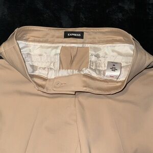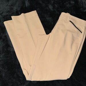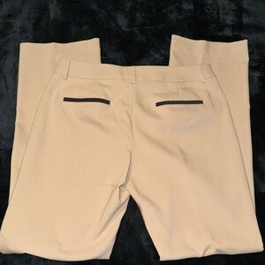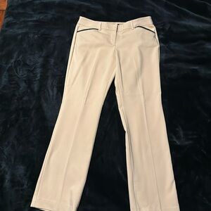 These are a very nice pair of dress pants in khaki with black accents. Very comfortable, straight leg style, only worn two times. Machine wash on gentle and dry. Non-smoking home