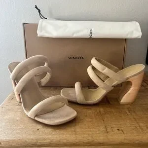 Vince "Dara" three band mule sandals exudes elegance and fun on a comfortable 3.5 inch stacked sculptural heel. Padded straps allow for comfort and slip on mule style allows for easy wear.