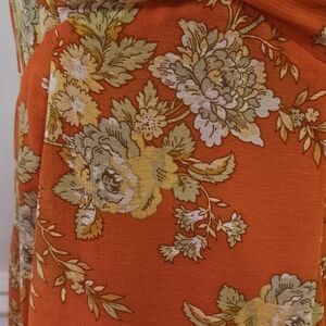 Features: Pretty Urban Outfitters Orange/Yellow MultiColor Floral Strappy Ruffle Maxi Dress,Large. 4 button V-Neckline. Strappy spaghetti shoulder and back straps that tie. Back Exposure. Hidden back zip closure. Front thigh split. Multi-Seasonal. Multi-Occasional