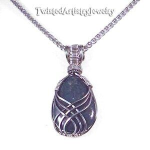 Neck chain measures approximately 18" long with a 2" long extension chain and is made of hypoallergenic stainless steel. The pendant is approximately 2" long. Wire used for the wrap is hypoallergenic enamel coated Titanium color copper for tarnish resistance and wearability.