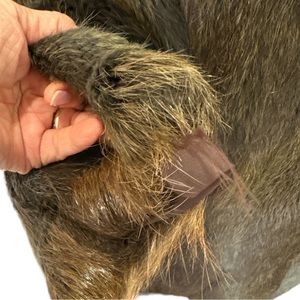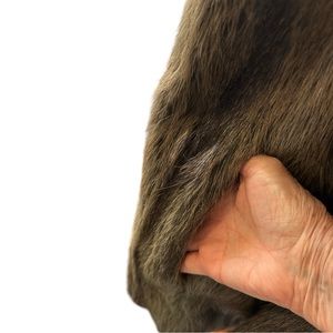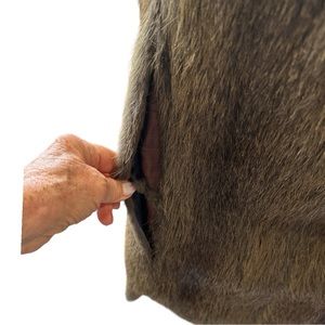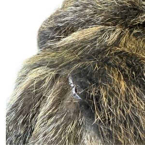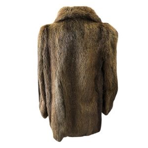 Vintage real fur (beaver?) custom made jacket is double acetate lined and has hook like closures in front. Variegated brown colors. Unbranded. Looks custom made. Side pockets. One interior pocket. Jacket has large fur rip at a seam in back. One shoulder and one sleeve need reinforcing. Warm and awesome, let’s recycle these old furs!