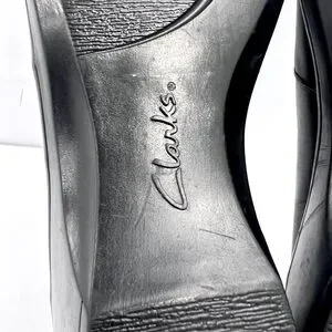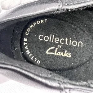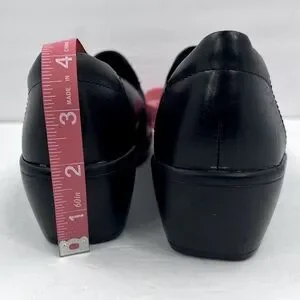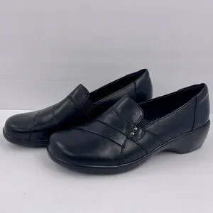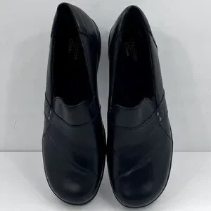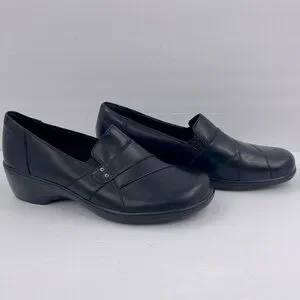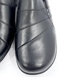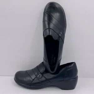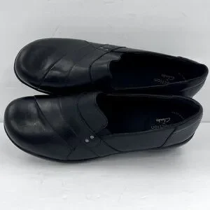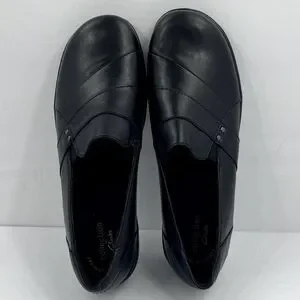 CLARKS, ULTIMATE COMFORT TECHNOLOGY, WOMEN’S MAY MARIGOLD LEATHER BLACK SLIP-ONS, SIZE 8